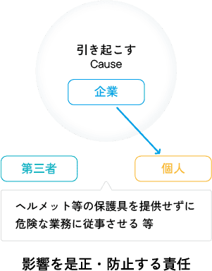 企業が自社の活動を通じて、従業員や地域住民などに人権に関する負の影響を直接的に引き起こす場合です。たとえば、自社の労働者にヘルメットなどの保護具を提供せず危険な作業をさせるケースなどが該当します。