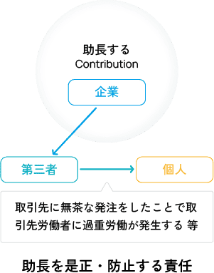 企業が自らの活動を通じて、人権への負の影響を助長してしまう場合です。たとえば、納期直前に仕様変更を告げた結果、取引先の労働者に過重労働を強いることになるケースが該当します。意図せずとも、企業活動が人権侵害の一因となることがあります。