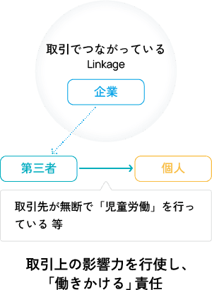企業が人権への負の影響を直接「引き起こして」おらず、「助長」もしていない場合でも、自社の製品やサービスを通じて人権への負の影響と「取引でつながっている」場合が該当します。たとえば、契約に反してサプライヤーが児童労働者に業務を再委託するケースなどです。このような場合、企業には直接是正する責任は負わないとされていますが、取引関係を通じて影響力を行使し、改善を促す責任があります。